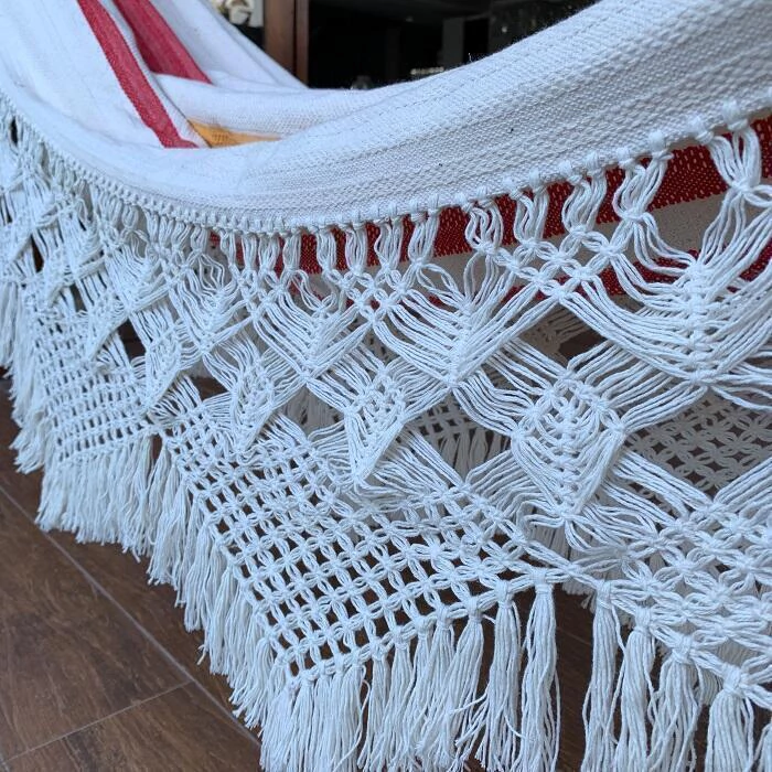 Com a Rede de Dormir Algodão Casal Jaguaruana com listras amarelo, vermelho e bege e varanda em macramê, você transforma qualquer ambiente em um convite permanente ao descanso, unindo estilo, aconchego e um visual que se destaca na decoração.
